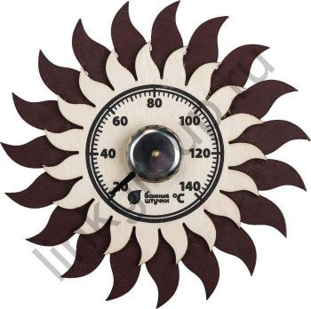 Термометр БАННЫЕ ШТУЧКИ Солнышко 13х13х2,5 см Термометр "Удовольствие" для бани и сауны предназначен для измерения температуры воздуха в парной комнате. Изготовлен из натурального дерева и метплла. Он предназначены для использования в бане и сауне. «Банные Штучки» поддерживают традиции настоящей душевной русской бани, лечащей разум, тело и душу - той бани, где сходят семь потов, душистый пар ласково обволакивает тело, а вода смывает все заботы и тревоги