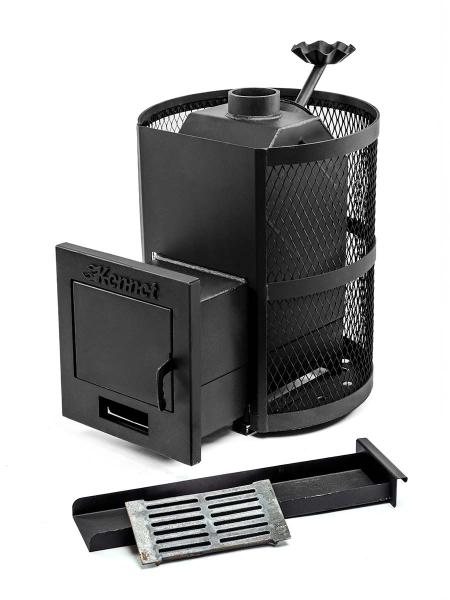 Современная банная дровяная печь с открытой съемной сеткой-каменкой предназначена для обогрева парильного помещения объемом до 14 м³ и получения влажного и сухого пара. Данную модель отличает глубокая закрытая каменка для максимального задержания тепла в печи. Увеличенный объем камней в сетке-каменке обеспечивает стабильную температуру в парильном помещении и способствует лучшей парогенерации. Достоинствами печи являются несложная установка, возможность переноски, простота использования. В комплект печи входит парообразователь. Диаметр дымохода ф115мм. Длина топочного тоннеля 250мм. Объем камней в сетке-каменке 100-110кг. Объем камней в закрытой каменке 15кг. Толщина используемого металла для топки печи толщиной 4,0мм. Толщина металла закрытой каменке 4,0мм.Есть возможность использования стекла вместо стальной заглушки, размер стекла 180х230х4,0мм.