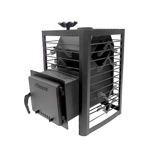 Современная банная дровяная печь с открытой съемной сеткой-каменкой предназначена для обогрева парильного помещения объемом до 14 м³ и получения влажного и сухого пара. Данную модель отличает глубокая закрытая каменка в форме многогранника для максимального задержания тепла в печи. Увеличенный объем камней в сетке-каменке обеспечивает стабильную температуру в парильном помещении и способствует лучшей парогенерации. Достоинствами печи являются несложная установка, возможность переноски, простота использования и дожиг вторичных газов. В комплект печи входит парообразователь, который можно установить спрвой или слевой стороны. На дверце печи имеется регулировка подачи воздуха. Диаметр дымохода ф115мм. Длина топочного тоннеля 200мм. Объем камней в сетке-каменке 70кг. Объем камней в закрытой каменке 15кг. Толщина используемого металла для топки печи толщиной 3,0мм. Толщина металла закрытой каменке 4,0мм.Есть возможность использования стекла вместо стальной заглушки, размер стекла 160х250х4,0мм.